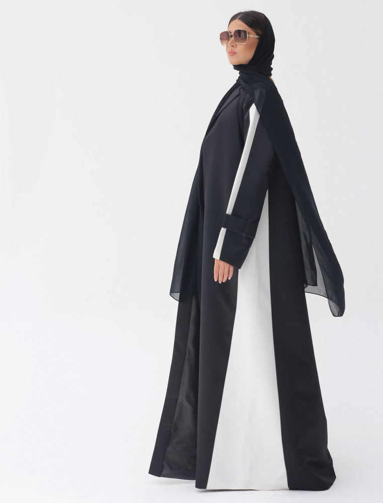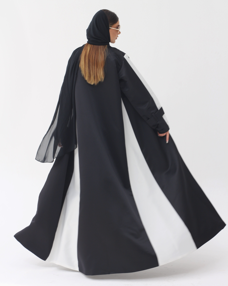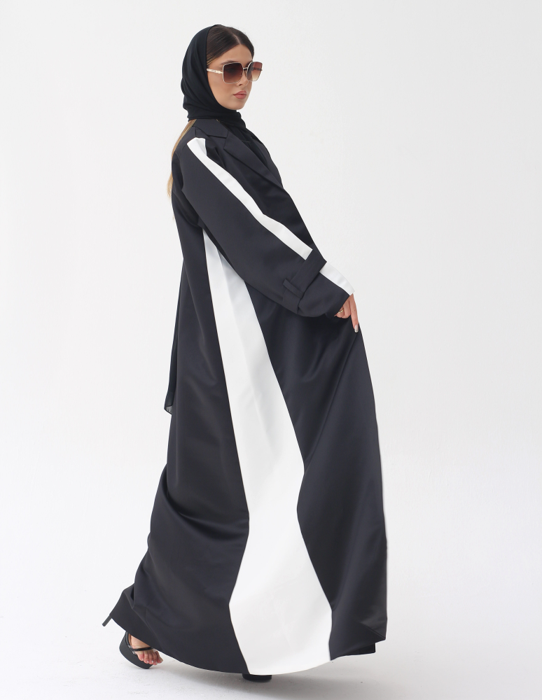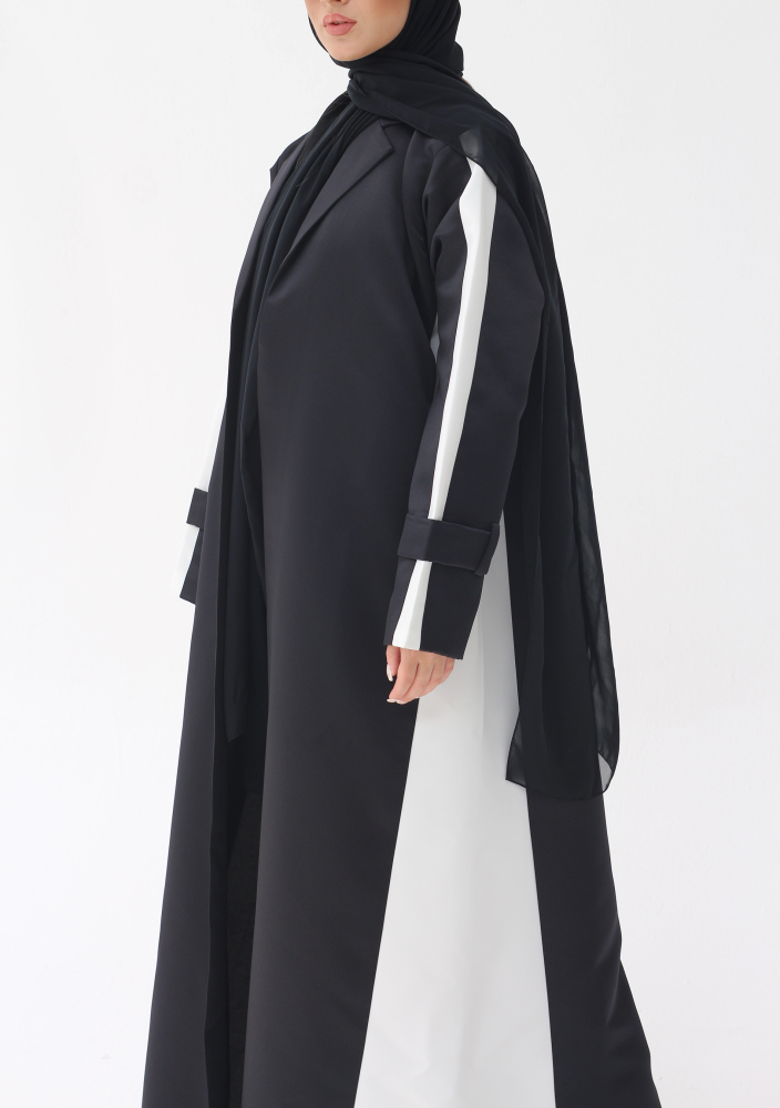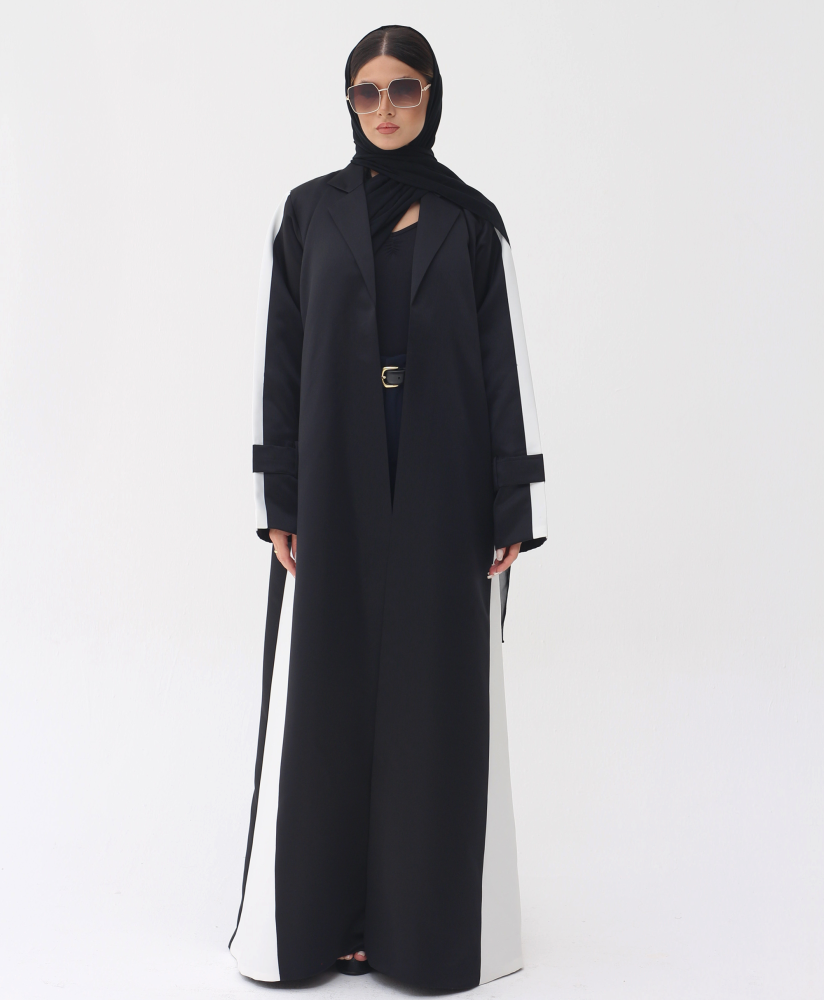عبايه بليزر باللون الأسود مع تدخيلة بيضاء من StyleTalk تصميم عصري وأنيق يجمع بين الراحة والفخامة مصممة بخامات عالية الجودة توفر مظهراً راقياً يناسب جميع المناسبات الرسمية والكاجوال
