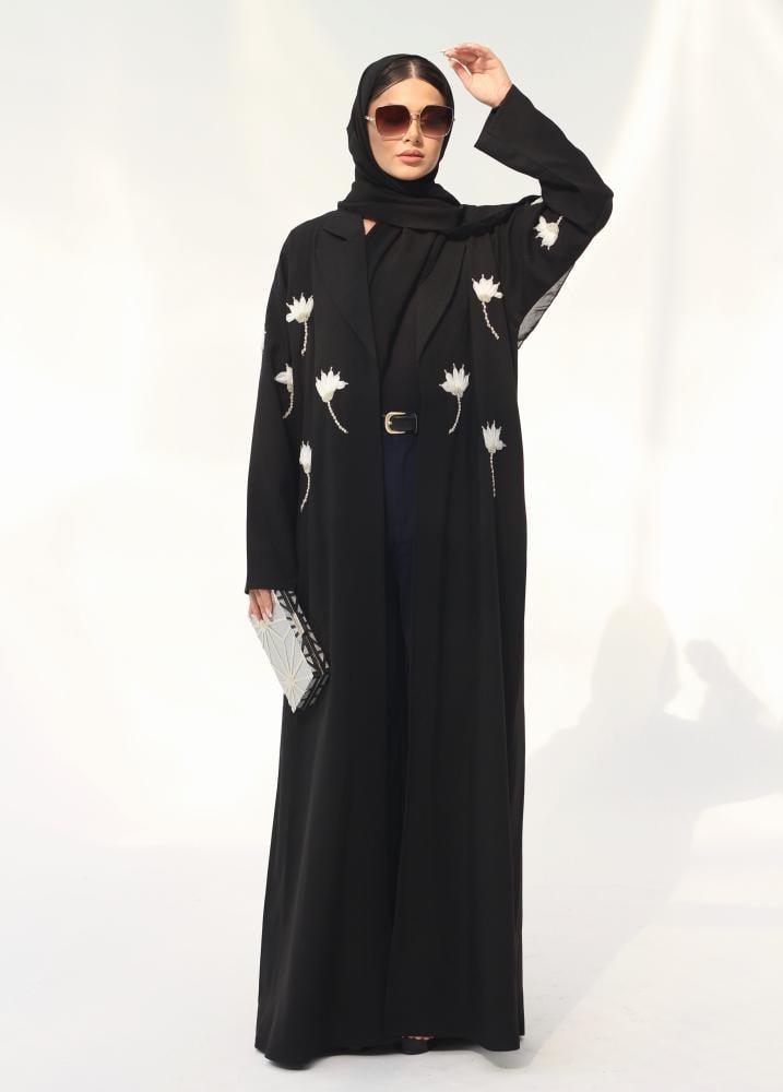 - تطريز ورد ناعم يضفي لمسة أنثوية راقية تعزز من فخامة العباية.