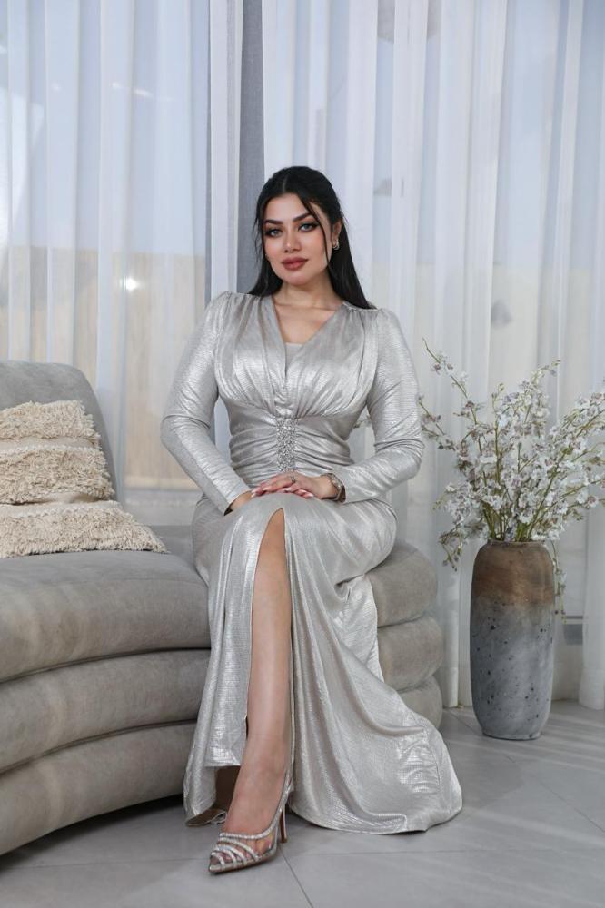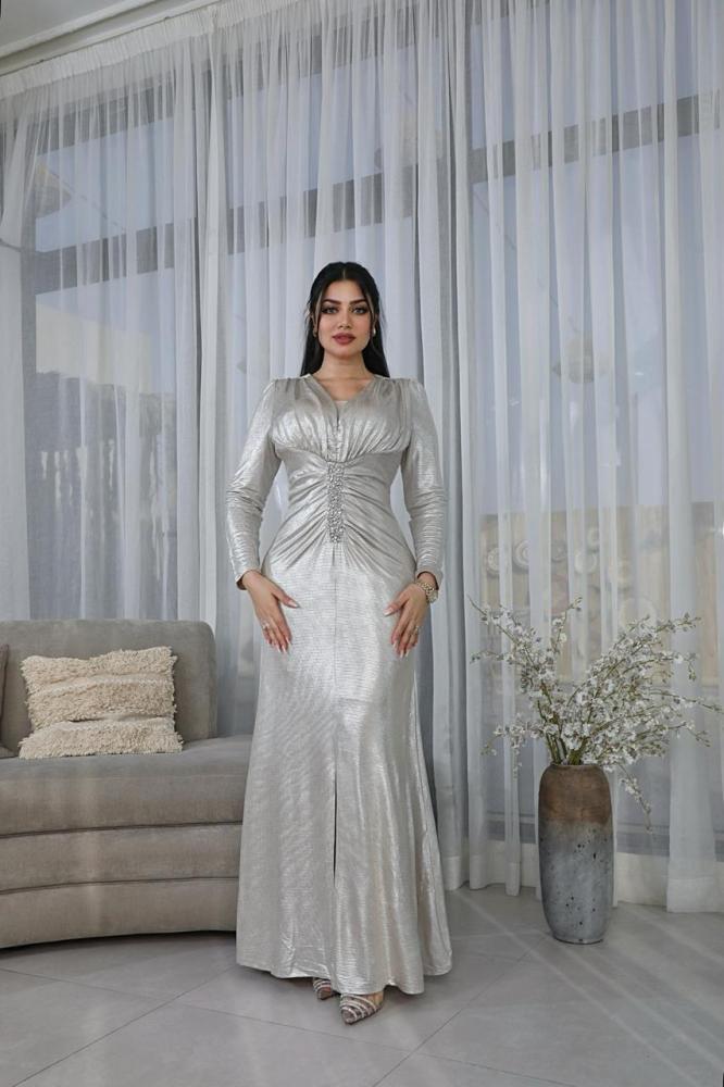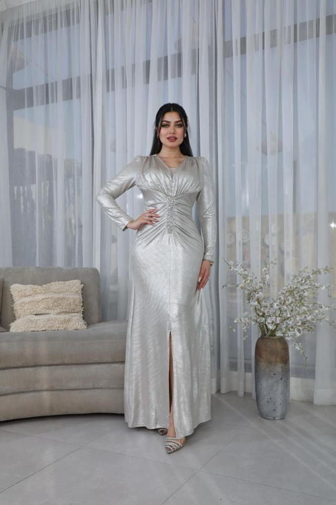 - اسم المنتج: فستان سهرة رمادي بكرستال وفتحة أمامية